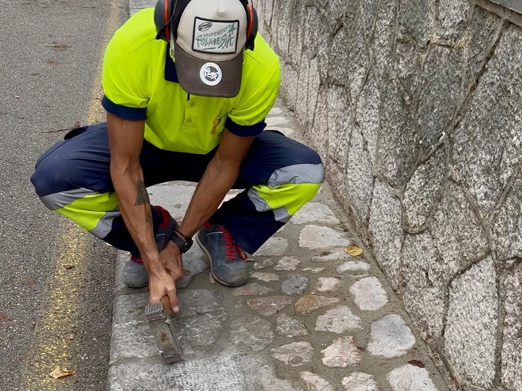En el marc dels treballs de renovació de diversos trams de les aceres del carrer d’Isabel II, els operaris treballen en el buixardat de les pedres que evitaran que siguin...