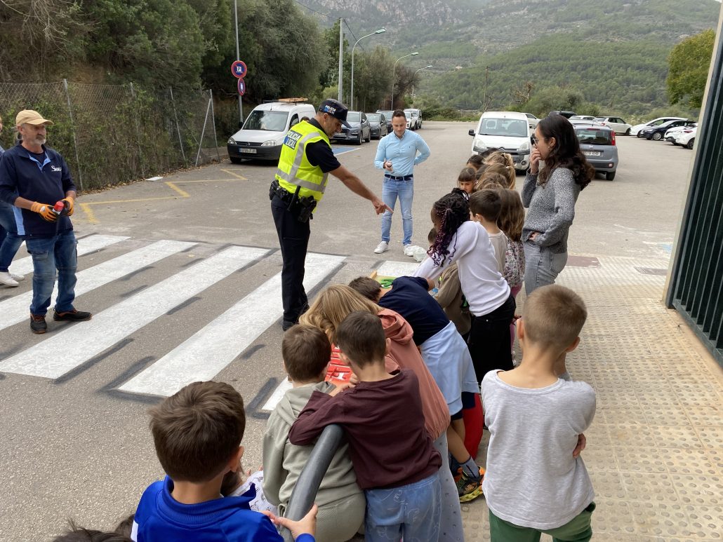 L’escola Es Puig també s’ha sumat a la iniciativa que promou el departament de Governació amb la col·laboració de diferents centres escolars del municipi. Així, els passos de vianants localitzats en aquella zona ja han incorporat la inscripció “Atura, mira, passa”.
