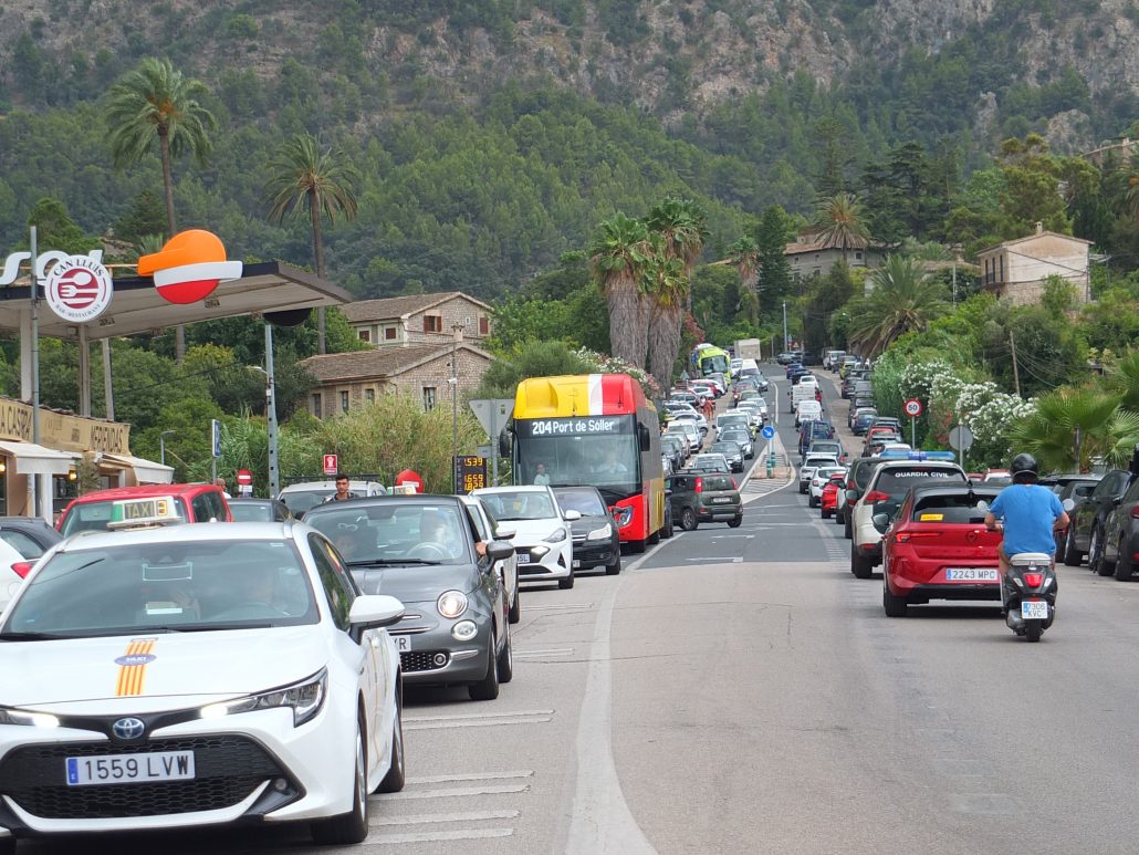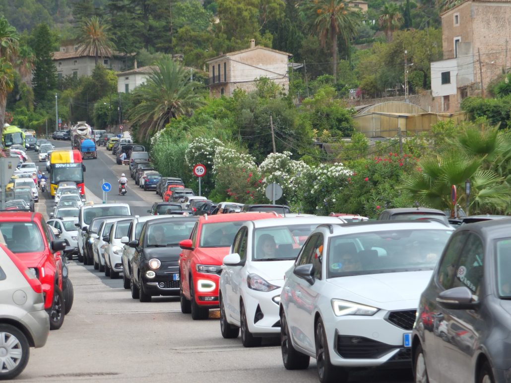 Transitar avui per dins Sóller s’ha convertit en una autèntica proesa, ja que el mal temps ha fet que l’increment de vehicles circulant hagi provocat un caos circulatori no sols als accessos a la vall, sinó també per dins Sóller.